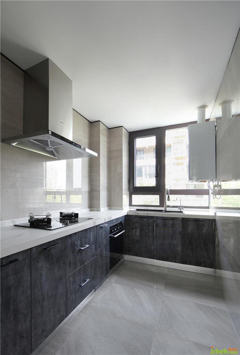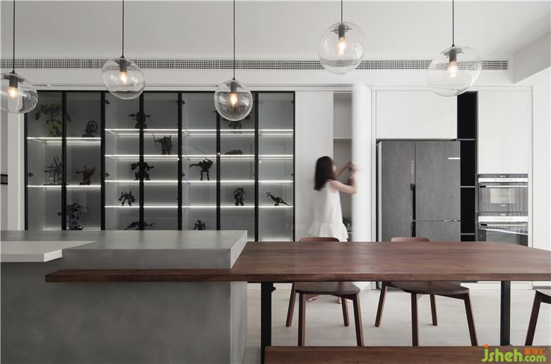 ▲全屋定制的島臺(tái)與餐桌無(wú)論是尺寸還是樣式都十分契合整屋的氣質(zhì),島臺(tái)與餐桌銜接之處也巧妙的為島臺(tái)側(cè)面起到了裝飾效果。餐廳柜體是由展示柜與電器高柜結(jié)合的形式,材質(zhì)上分別選擇黑色鋁框玻璃與白色亮面烤漆,剔透氣質(zhì)與純凈的白色結(jié)合既可以將收藏品妥善展示也將餐廚電器合理的嵌入,保持大空間完整不顯得破碎,添加的燈帶效果為手辦的科幻感帶來(lái)更多加成。仿巖板的冰箱門(mén)與磐多魔的灰色呼應(yīng),讓家中更多讓人熟悉又放松的色調(diào)。