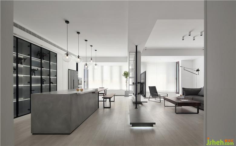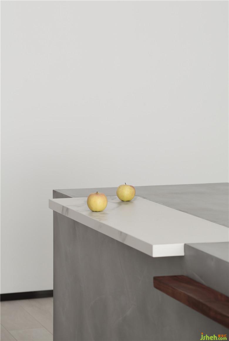 ▲餐廳選擇了西廚島臺(tái)與餐桌的形式,恰當(dāng)?shù)某鋵?shí)開(kāi)闊空間避免空泛,也讓生活方式愈加靈活。島臺(tái)的側(cè)面與操作臺(tái)面分別選擇了不同肌理的磐多魔涂料,半嵌入的大理石小臺(tái)面讓灰色島臺(tái)避免整體一色的乏味。