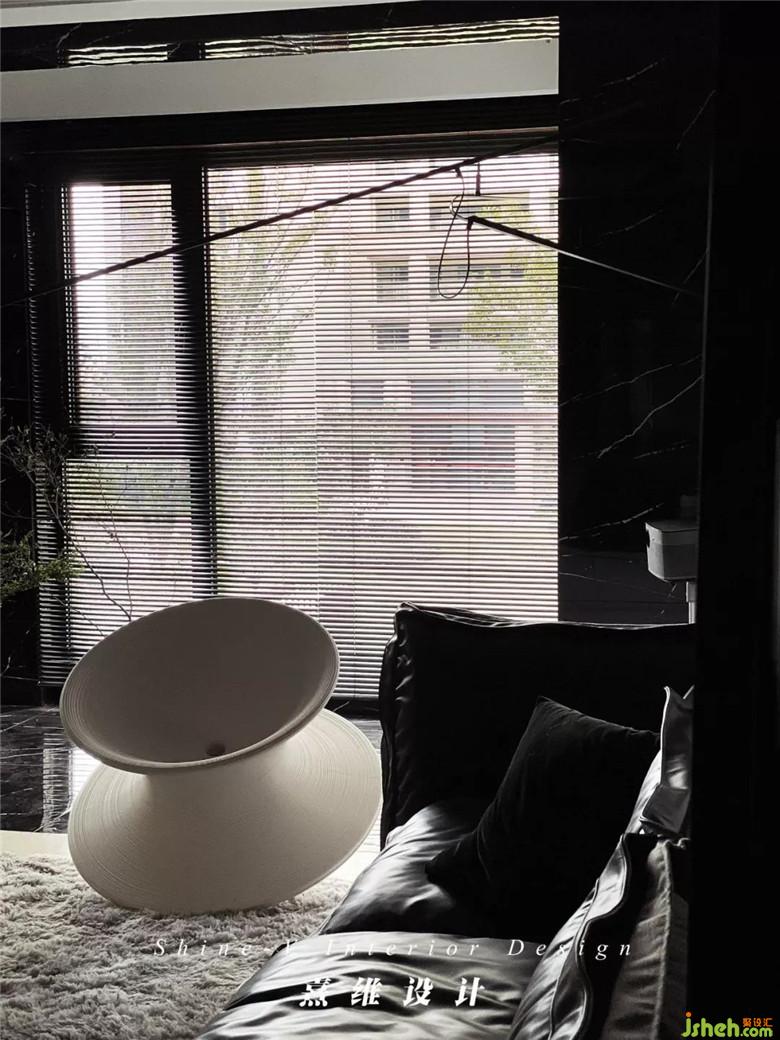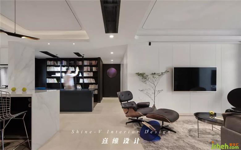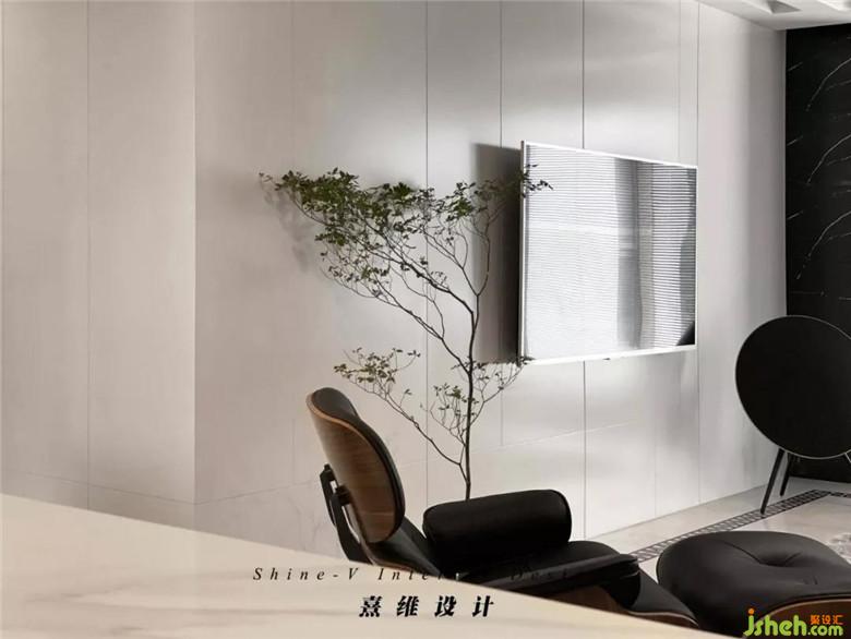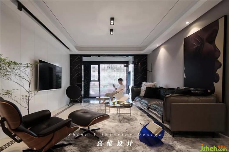 皮質的沙發(fā)輪廓分明,灰黑的配色與白色電視背景墻相對,視覺感更具張力。帶腳凳的伊姆斯椅,符合人體工程學的設計配合內側的皮質軟墊,是復古的輕奢兼具現代外型的自由體驗。