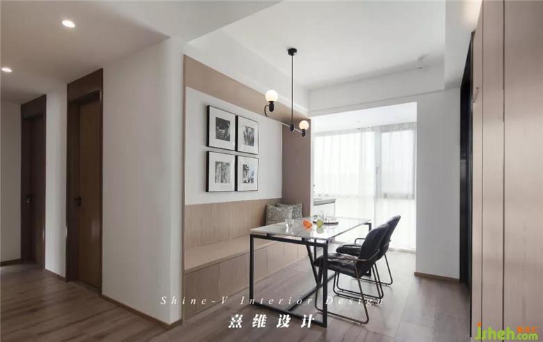 ▲墻面與收口裝飾電視背景墻同材質(zhì)木飾面,下部為封閉的收納空間??ㄗ胁勘A舻陌讐εc木飾面搭配,讓餐廳空間變得更松弛些,自由些。
