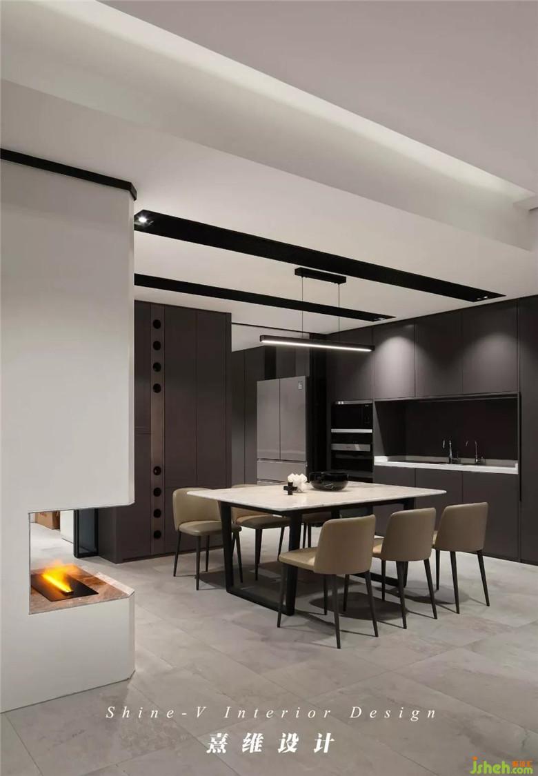 餐桌的兩側(cè)設(shè)立多功能柜體。酒柜、日常雜物柜、蒸烤箱一體柜、吊柜以及補(bǔ)充功能的島臺(tái),最具煙火氣的實(shí)用在這里被明確下來(lái)。