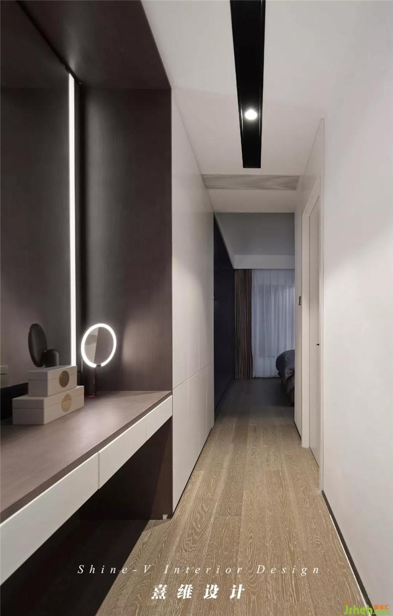 ▲柜子與柜子之間,嵌下一塊梳妝臺的區(qū)域,盡管在并不寬余的走道邊,但由于電視背景墻處的另外一扇門,走道被臨時占用也不會造成不便,椅子不用時可以收在梳妝臺之下,維持日常動線的通暢。