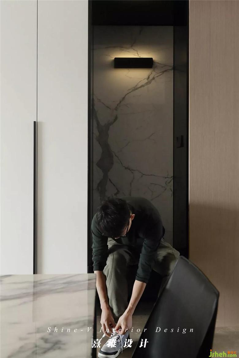 ▲柜體之間空出一截作為換鞋凳使用,內(nèi)嵌與電視背景墻同材的裝飾板,這種呼應(yīng)讓空間內(nèi)的聯(lián)系更加緊密融洽。大理石裝飾板上添置一處隱藏光源,雖不顯眼,卻可以守候在晚歸的夜里。