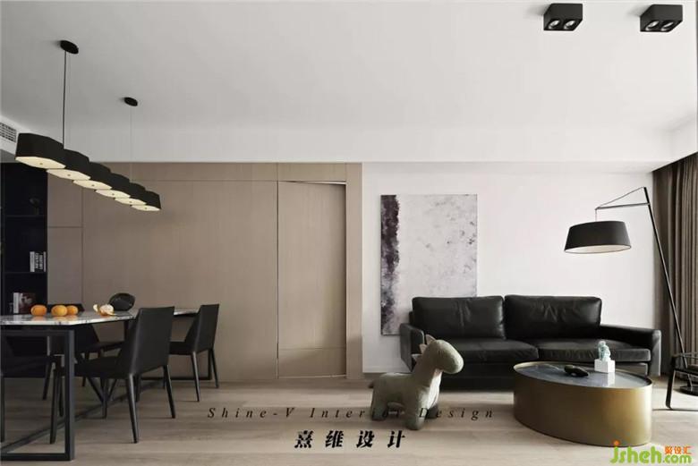 ▲白墻襯著黑色皮質(zhì)沙發(fā)有一點酷,臥室的隱形門藏在飾面板連綿的木色里,沙發(fā)這一側(cè)的配色呈現(xiàn)在更大塊面中,更顯家的舒展姿態(tài)。