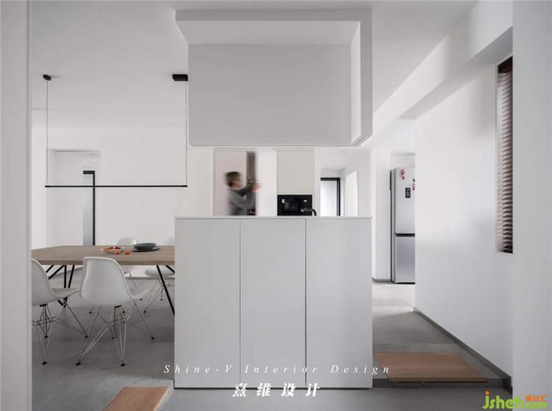 ▲原戶型玄關功能缺失,但業(yè)主還是希望入戶之后家可以不被一覽無余的全盤托出。于是裝修公司的設計師通過一個緊挨餐廳島臺的鞋柜配合頂部下掛的半隔斷,將眼前視線掩去大半。在此處將空間收束緊湊,平添玄關的“功能”與“形態(tài)”。