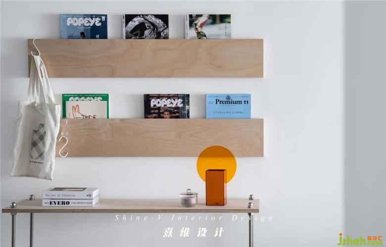 ▲鋼木結構置物層架最大程度露出這個家中白的底色,保持了空間結構的自由感,不增添絲毫沉重。與墻面貼合的雜志架,溫柔原木色從置物架層板沿襲過去,功能性不是它的目的,裝修公司讓白墻不被冗余的功能附著,為空間帶來呼吸可聞的輕盈感受。