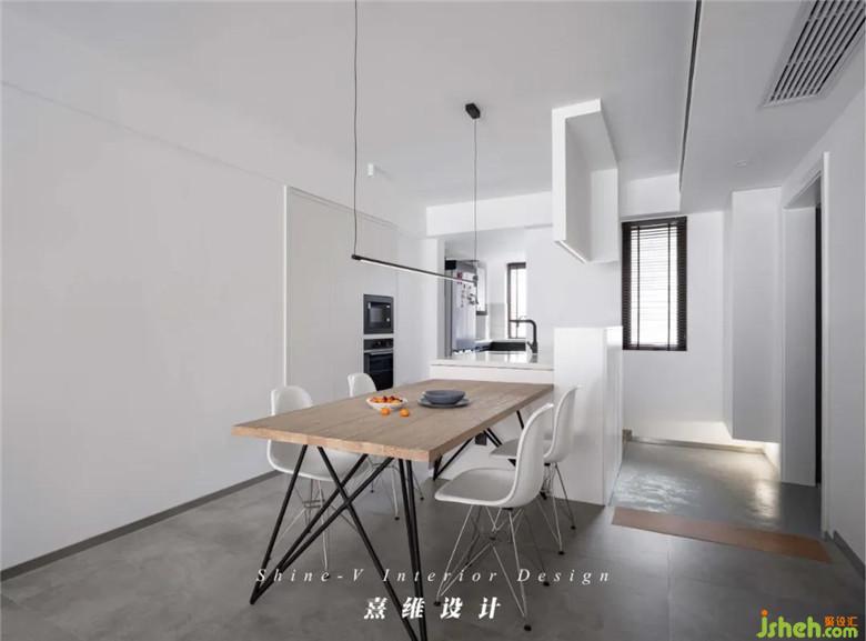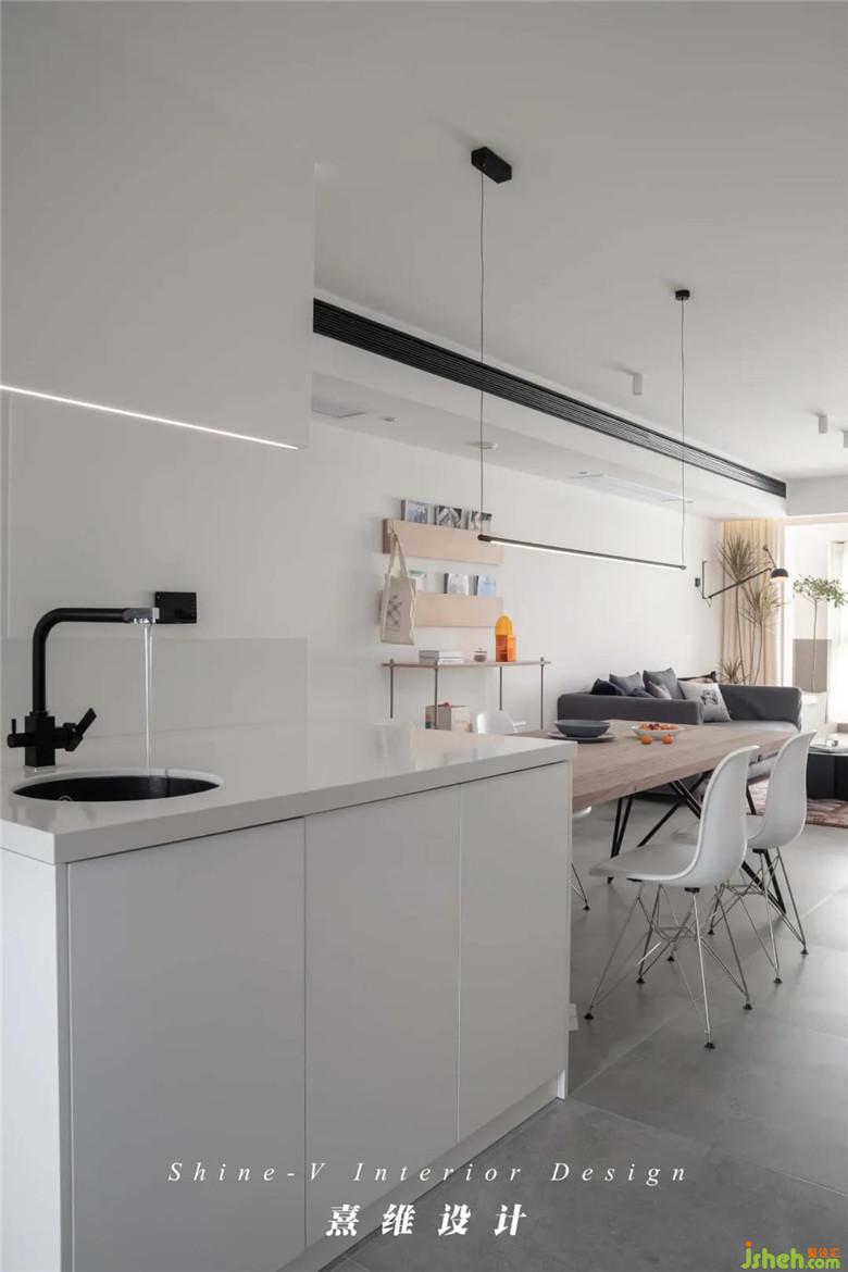 ▲“餐廚一體”是現(xiàn)代住宅中常見(jiàn)的生活場(chǎng)景,選擇這般滿目的白色、極簡(jiǎn)的線條保證了功能復(fù)合空間中的最佳的穩(wěn)定感與秩序感。
