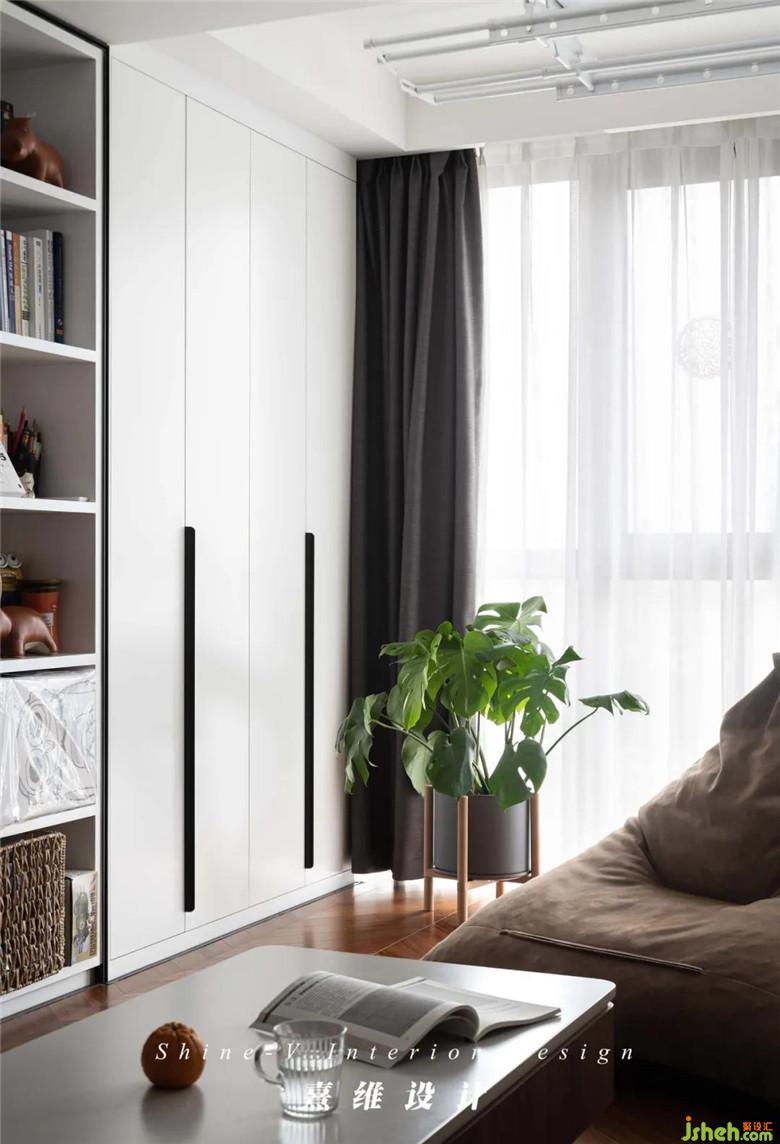 ▲電視背景墻的白色繼續(xù)延伸,至陽(yáng)臺(tái)一側(cè),成為可以囊括雜物的封閉收納空間,由琳瑯滿目升騰成統(tǒng)一的白,裝修公司以內(nèi)置最大限度的減少雜亂,萬(wàn)千思緒被修整輕盈。