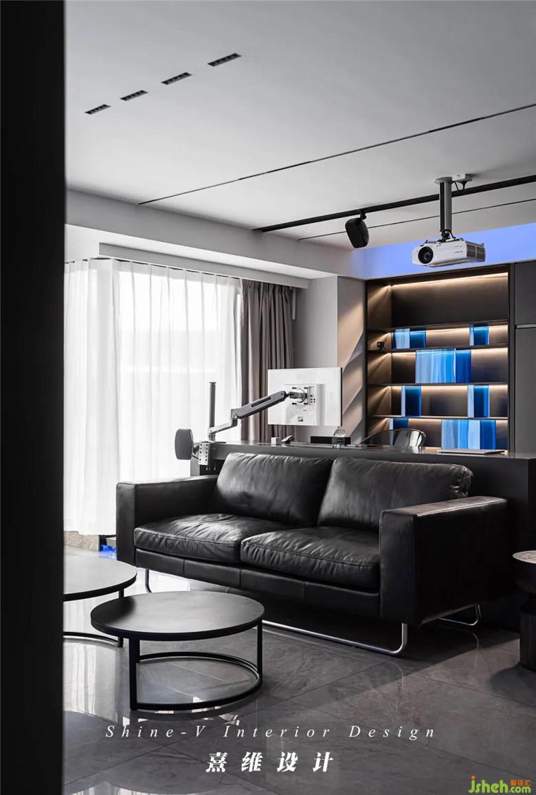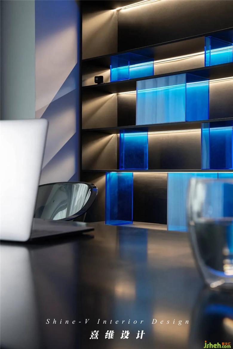 ▲工作區(qū)的柜體,一部分是開放柜,封閉樣式的另一部分其實是下翻床。開放柜內裝置上燈帶,擺上定制的亞克力小盒子,光透出來,這些不再是冷冰冰的幾何組合,傳達出一種持續(xù)性的、神秘的迷失感,像引人探索的科幻未來,格外適合家庭中小影院的低暗氛圍。