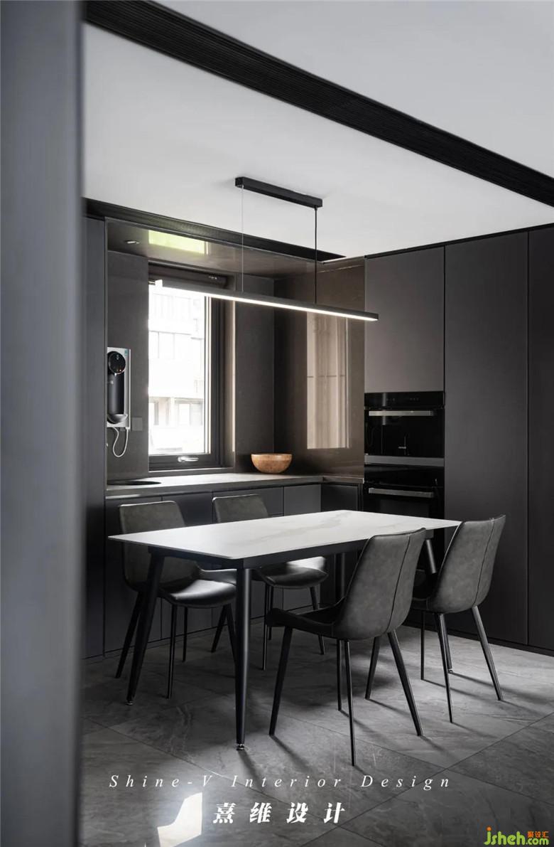 ▲裝修公司在保證餐桌的合理擺放以及過道的寬綽之后,避開獨(dú)立島臺(tái)占位較大的缺點(diǎn),根據(jù)實(shí)地環(huán)境,將島臺(tái)放置在鄰近窗戶的墻邊,不被遮擋的窗讓餐廳沐浴在多方位的自然光線之下,功能俱全,氛圍亦佳。