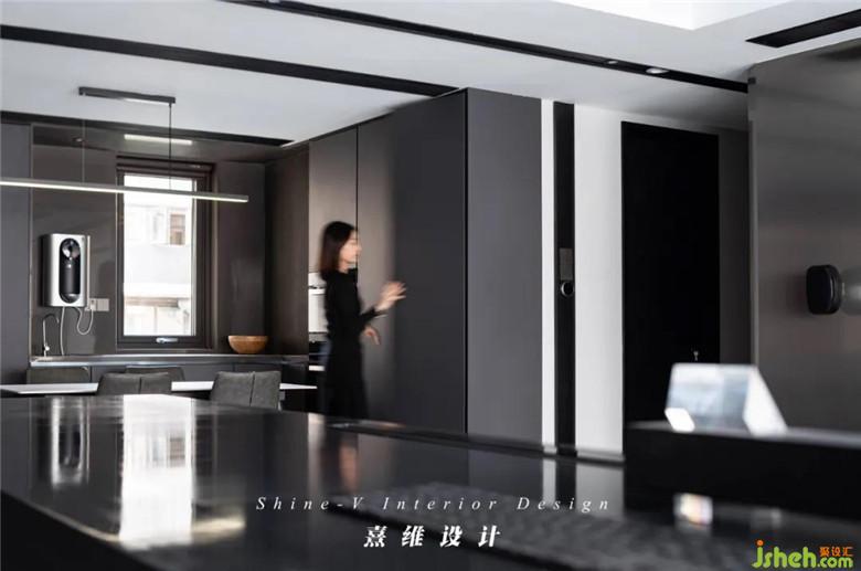 ▲到頂?shù)墓耋w包容餐廚電器及雜物,與島臺(tái)的地柜建立連接,為餐廳提供可觀的存儲(chǔ)空間。貫穿在空間中的深灰色柜體,啞光烤漆觀感細(xì)膩,連續(xù)的手法消除獨(dú)立感,于開放的空間中創(chuàng)造具有質(zhì)感的精神場域。
