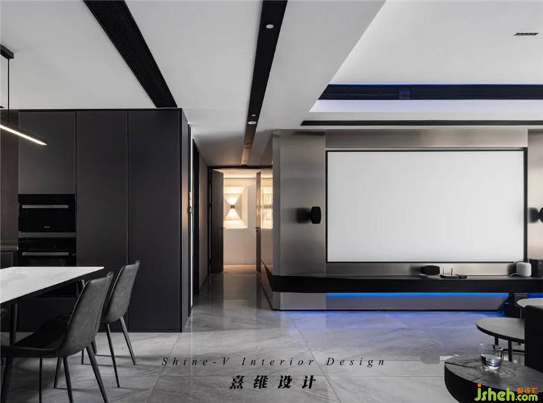 ▲包覆電視背景墻的不銹鋼繼續(xù)以護(hù)墻板的形式遮蓋住走道一側(cè)的墻體,映射的光影弱化了走道空間的窄,為其折入寧靜,正對(duì)著的主臥只露出部分墻體,由散出暖色的光源指引方向。