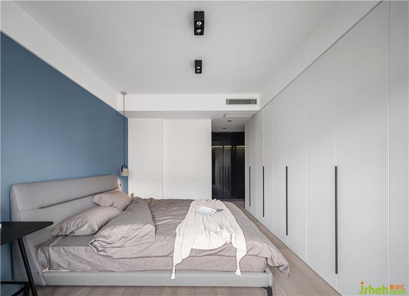 ▲整面收納空間集中在此,外觀仍以白色表述。通過外層的半透窗簾追溯光的源頭,再行至床頭處,梳妝臺(tái)和床枕在靜水流深的一面藍(lán)色中,柔光浮動(dòng),空間帶著淡意的暖色。