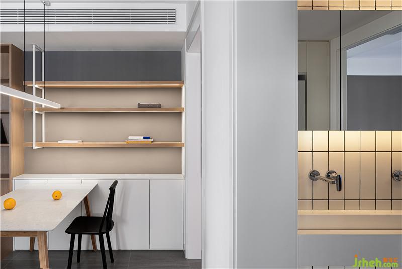 ▲裝修設(shè)計為了更貼近家中人口的需要,衛(wèi)生間功能做了干濕分割,干區(qū)獨(dú)立出來嵌入從主臥中分割出的路徑邊緣,距離餐廚、臥室都很近。亞克力一體式臺盆,用足夠的長度補(bǔ)充被壓縮的寬度,適合多人同時使用。
