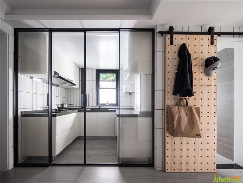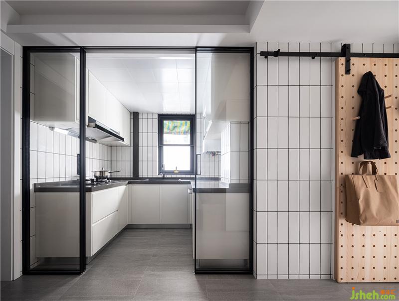 ▲餐廚同享一個空間,玻璃移門拉開一條透明的界限,為沒有窗戶的餐廳引入自然光。冰箱被嵌入通往主臥的走道邊緣,留給廚房足夠的空間擴(kuò)展出最實(shí)用的u型櫥柜、雙側(cè)吊柜。