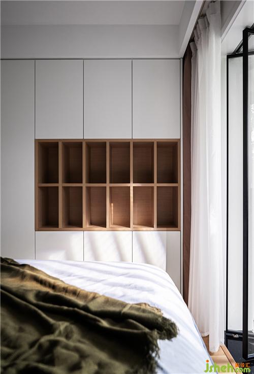 ▲從主臥的整面白色衣柜中破出兩層開放的小格,露出原木色內(nèi)里,裝修設(shè)計在有限的空間內(nèi)功能交織組合,實(shí)現(xiàn)形式被準(zhǔn)備的更多樣,光斜著灑落,個人主義渺小而溫暖,卻是有關(guān)家的具象表達(dá)。