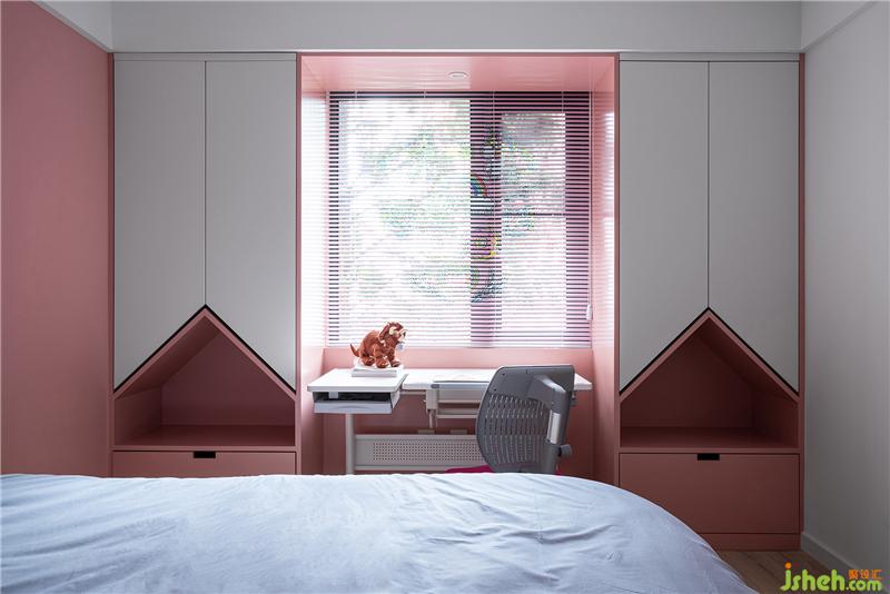 ▲兩個(gè)一樣的衣柜屬于兩位小女孩兒,上方掛置衣物、中部開(kāi)放展示柜、下層抽屜,細(xì)化后的功能分區(qū)從小培養(yǎng)出條理性。窗戶被衣柜合圍,書(shū)桌擺在窗前,靠近天光,景框設(shè)計(jì)描繪孩子學(xué)習(xí)、娛樂(lè)等功能化場(chǎng)景。