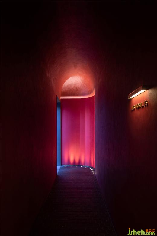 進入甬道,眼睛要先適應(yīng)突然暗下來、涌向身體的光,洗墻光下橘色浮在石釘路上,墻壁斑駁微光,你仿佛聞見夜晚潮濕城市與內(nèi)陸河水的味道。你想要快點兒走到轉(zhuǎn)角,又被未知陌生暗暗牽拉著。