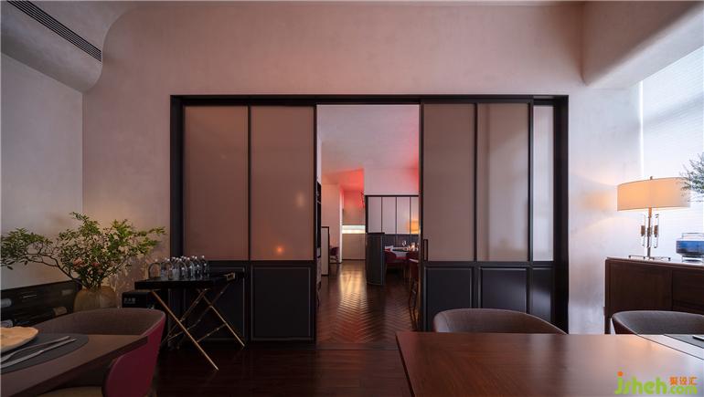 拱券式天花在頭頂扭力交疊,與有機(jī)三曲面定義出雕塑感空間外殼,柔軟的動感在強(qiáng)有力的材料扭結(jié)中滲透出來。餐廳設(shè)計(jì)向內(nèi)經(jīng)過旋扭折疊,視野豁然、場景轉(zhuǎn)換,抵達(dá)帶有古典意向和東方觸感的餐區(qū)。多組場景在內(nèi)部拼貼,緊湊卻保持一份疏離感。玻璃幕墻與隔斷移門對空間進(jìn)行蒙太奇式的分隔連接,城市隨機(jī)性與陌生激發(fā)的歸屬感暗含在動線邏輯中??臻g環(huán)游中,無拘束的親切穩(wěn)妥將逐步瓦解對法餐高調(diào)繁復(fù)的刻板印象。