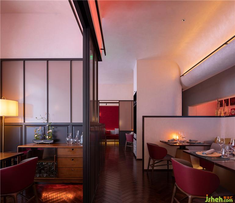 餐廳設(shè)計(jì)立面上,藝術(shù)涂料與壁布拉出層次;黑色金屬條勾勒邊緣,與渾厚結(jié)實(shí)的弧面線角形成律動(dòng);沿用老店具有識(shí)別性的紅,加以矯正后體現(xiàn)在絲綢、絲絨與皮革面料中;雀躍迷幻的紅、黃、藍(lán)多色燈光渲染出巴黎撩人的曖昧迷情;深胡桃地板依照法國(guó)規(guī)制鋪貼,與老店舊物一同將整個(gè)空間劇場(chǎng)拉入深沉背景中。