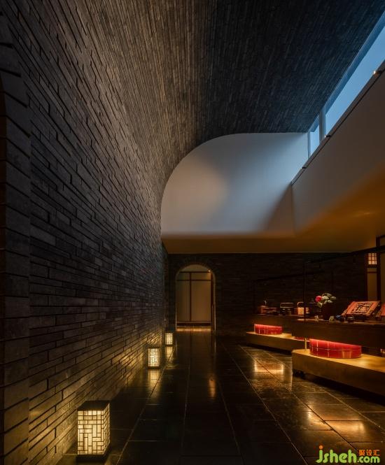 空間是在一個(gè)現(xiàn)代性的簡潔構(gòu)成下層層豐富遞進(jìn)的,條形灰磚與簡素的肌理漆在立面鋪陳延展,在垂直方向的天花盡頭彎折隱入天光,高度設(shè)計(jì)和弧面控制減少了對封閉邊界的感知,而它的意向既是安徽的也是北京的,作為空間敘事的大背景恒定而有力。