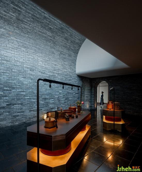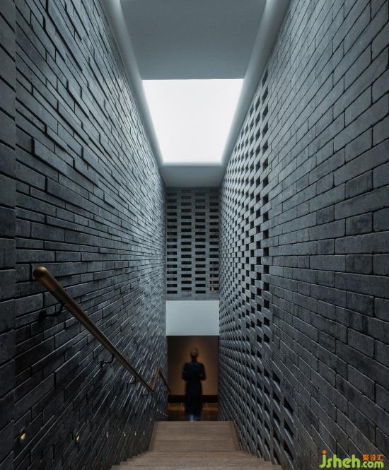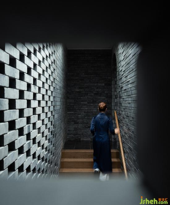 步入茶室需拾級而上,身側(cè)立面青磚有序陣列,天光傾瀉,恍若步入一個時間和空間都壓縮倒錯的通道,時間飛逝或停滯似乎皆有可能,正是經(jīng)過短暫的抽離,眼前豁然開朗——