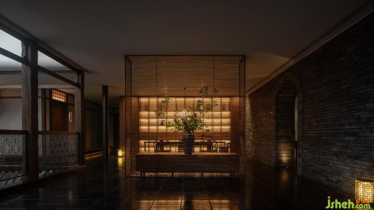 The display shelves, featuring traditional baskets, hint at the grandeur of Huizhou, while through the latticework, the tea room quietly awaits its guests at the end of the journey.