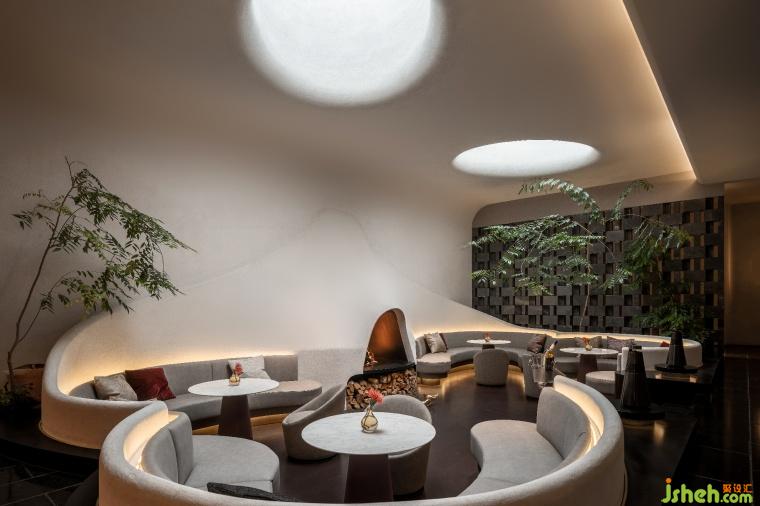臨側(cè)潔凈的下沉區(qū)是一個柔軟的樂池,使人想起一個寂靜的山谷,流暢的弧面勾勒出的卡座有如一片燦爛的云景,聚集在山上的酒神頂禮者從高處俯視它,日月毫不吝嗇潑灑它的光輝,天花的開孔更具神性的哲思。