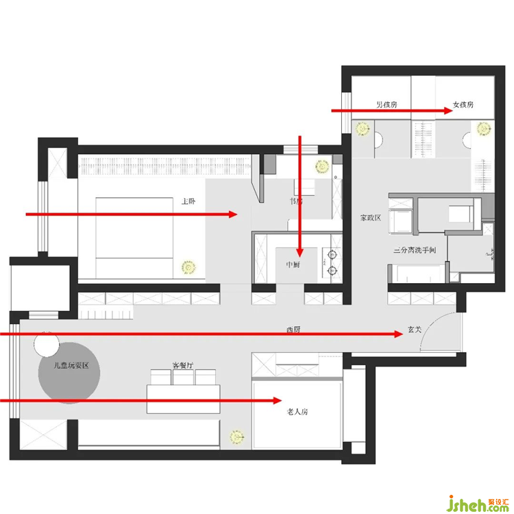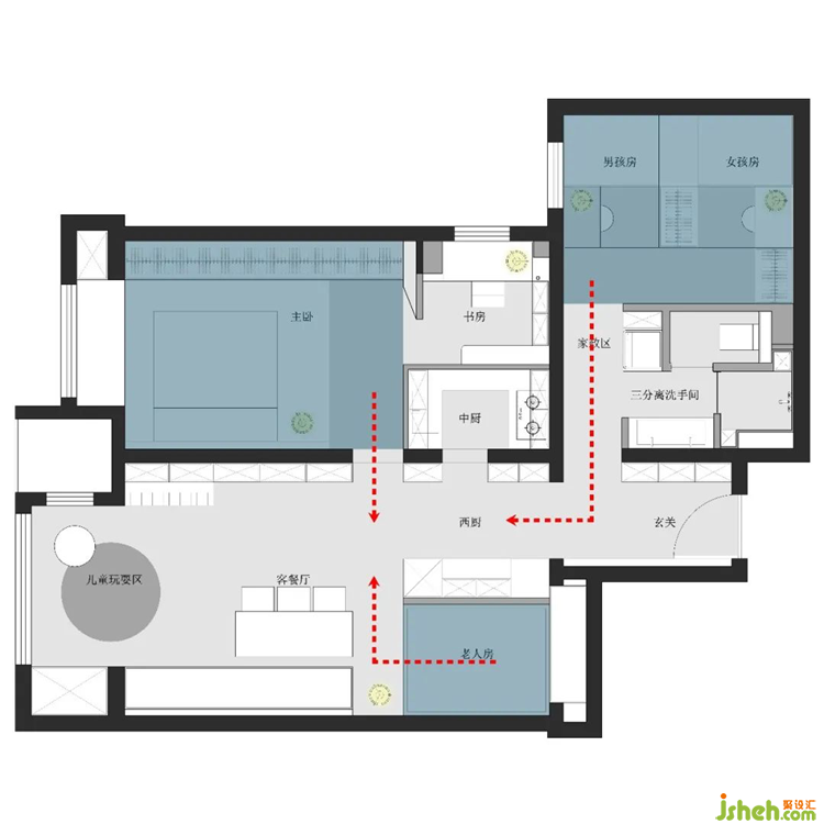 考慮到三代不同的生活習(xí)慣,老、中、幼的臥室并沒有安排在一起。在距離產(chǎn)生美的同時(shí),通過過道的指引,將家人互動(dòng)的區(qū)域鎖定在客餐廳和它的延長線西廚水吧上。