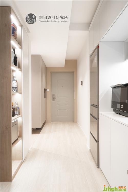 洗手間是唯一一處沒有自然光直射的區(qū)域。大面積采用亮色系,避免了暗衛(wèi)帶來的視覺壓抑感。