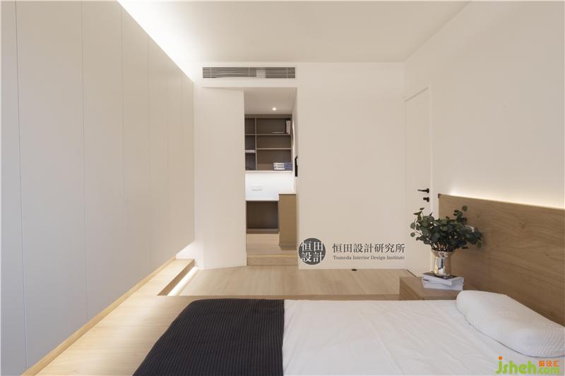 主臥大部分地面抬高,寢具采用地臺形式,以滿足暫時(shí)的小朋友與父母同住的需求。床尾打了整面白色柜子,柜體做抬高處理,提供充足儲物空間之余,也不顯得過于呆板沉悶。