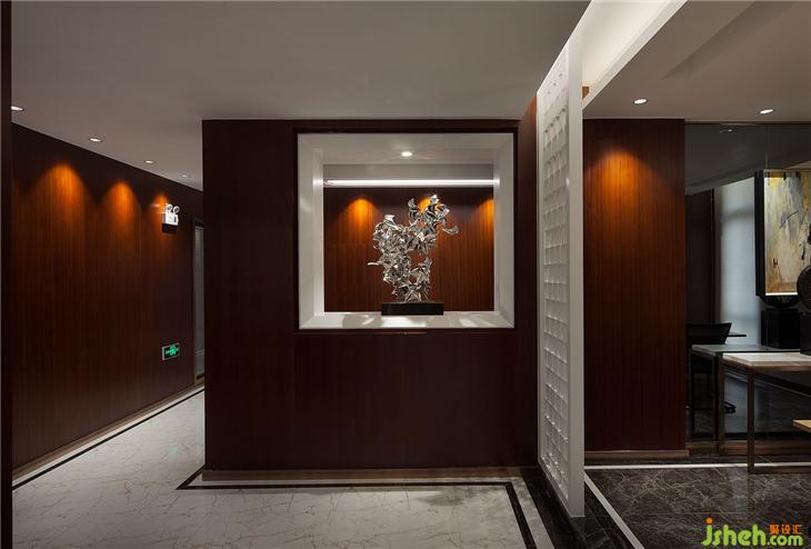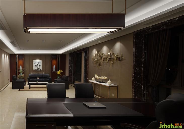 暗紅色的木墻與茶白色的辦公桌形成色彩對比,與冷暖交錯的燈光一同增強空間的畫面感,造成一定的視覺沖擊,在安靜的辦公環(huán)境中增添一份生氣,使辦公者思維更加活躍,工作更加積極。墻面避免使用過多裝飾,簡單幾件造型簡單、質(zhì)感輕巧的飾品畫龍點睛,偶爾的空間留白襯托出主體的氣氛。
