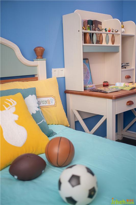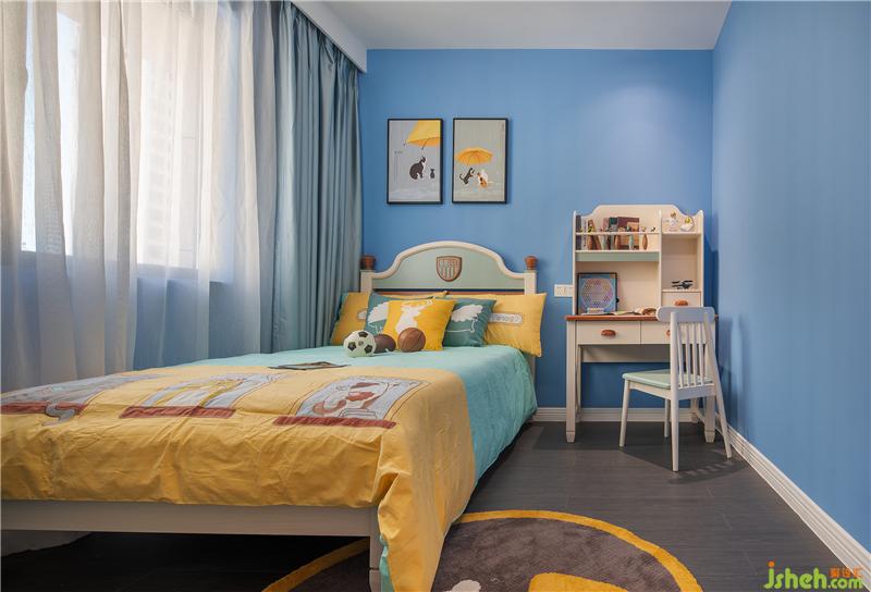 藍(lán)色,與純潔無(wú)比的童心最是相襯。室內(nèi)設(shè)計(jì)師以此為空間基調(diào),藍(lán)白呼應(yīng),干脆利落,正是現(xiàn)代白領(lǐng)父母對(duì)體面舒適的極致追求。加之暖黃色的床品、童畫(huà)多處點(diǎn)綴,設(shè)計(jì)之余更顯活力,創(chuàng)造出寶貝專(zhuān)屬的成長(zhǎng)空間。
