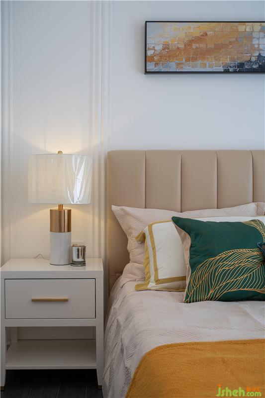 臥室布置淺色棉麻織物和乳白色系家具來制造舒適平和的觀感,燈飾與飾物搭配更顯簡潔輕致,整體呈現(xiàn)出一種舒適自然、安恬靜默的休憩氛圍,好似清泉流水,緩緩而歌,待亥子時刻,夜深人入定,山河夢間。