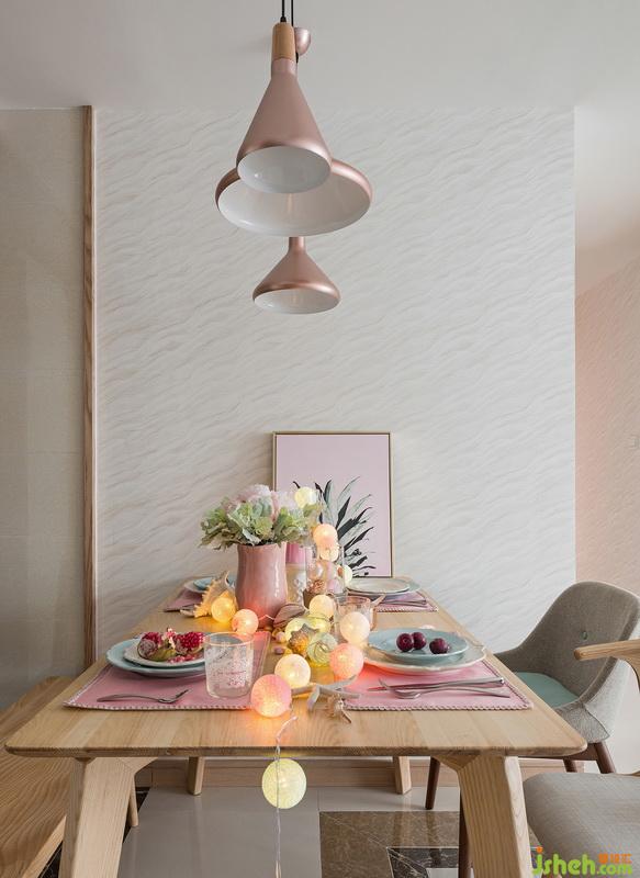 餐桌條凳等小家具裝飾選擇原木色,燈具和部分飾品選擇有線條美感或者玫瑰金色相結(jié)合的,提升空間氣度和質(zhì)感。