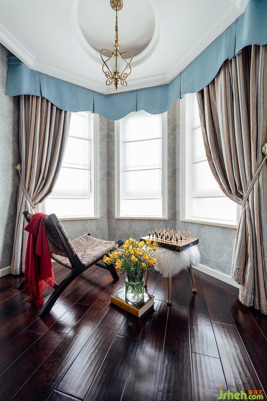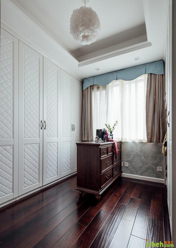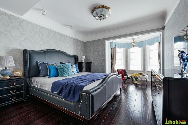 主臥延續(xù)客廳的主色調(diào), 彌漫著浪漫輕柔氣息,沒(méi)有過(guò)多的裝飾,在不同層次的藍(lán)的渲染下,打造出文雅清幽的居住氛圍。