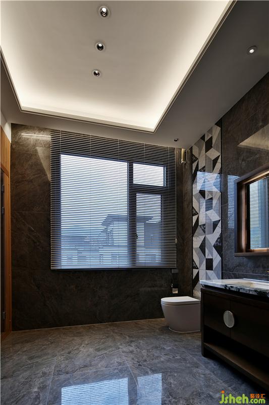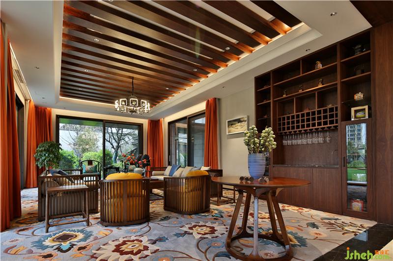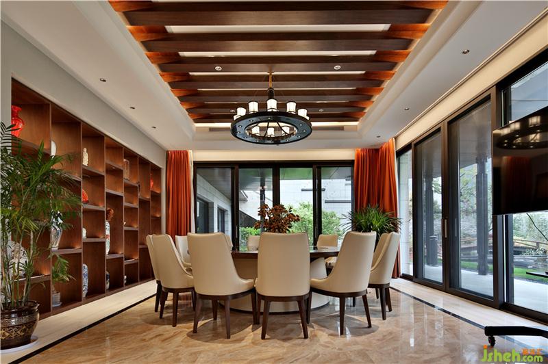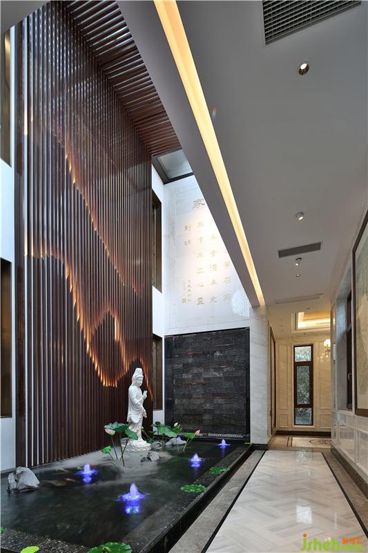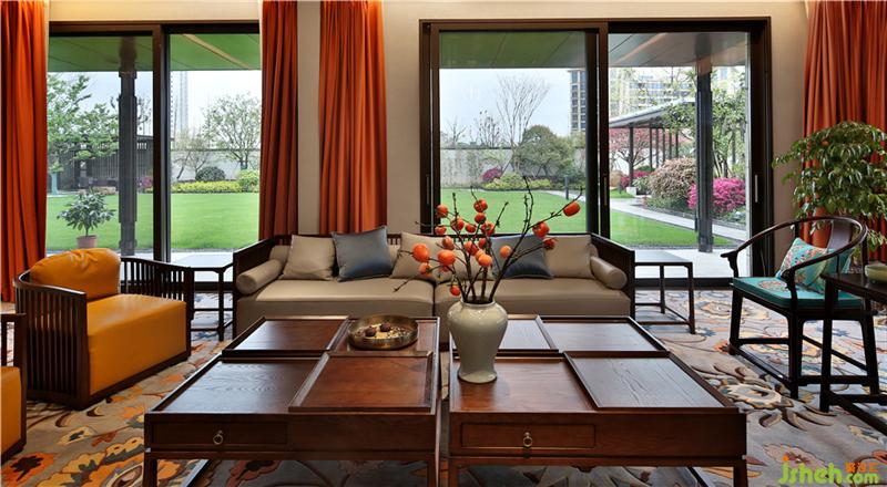 室內硬裝方面運用大面積的大理石鋪設以及軟裝方面中式家具的選擇、國畫的點綴,在空間中顯出別有風致的