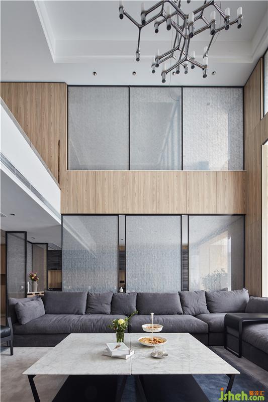 客廳的挑高空間,是整個(gè)項(xiàng)目的最大亮點(diǎn),我們希望整個(gè)空間能體現(xiàn)年輕而不失品味的質(zhì)感,所以地面用了大面積的爵士白大板磚,墻面我們則選了淺灰色的成品護(hù)墻板,一樓的餐廳隔斷以及二樓娛樂室的窗戶,通通用夾絲藝術(shù)玻璃來裝飾。黑-白-灰,通過不同材質(zhì)和比例的呈現(xiàn),一直都是經(jīng)典的搭配方案。整個(gè)設(shè)計(jì)中,最吸引的軟裝搭配就是這套寬大的沙發(fā)了。