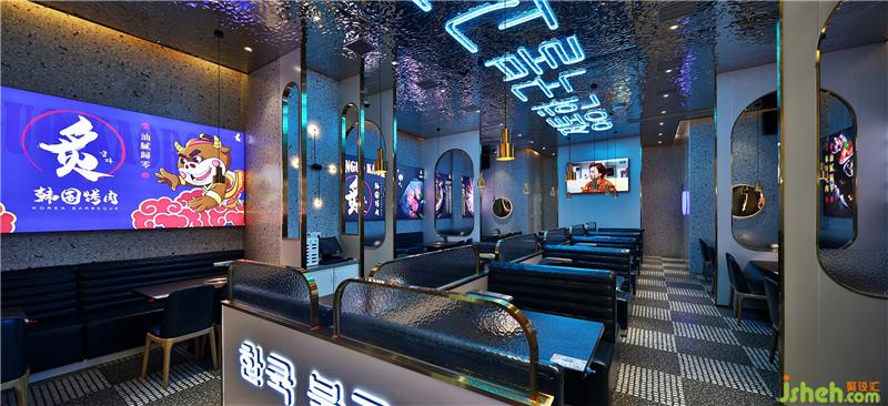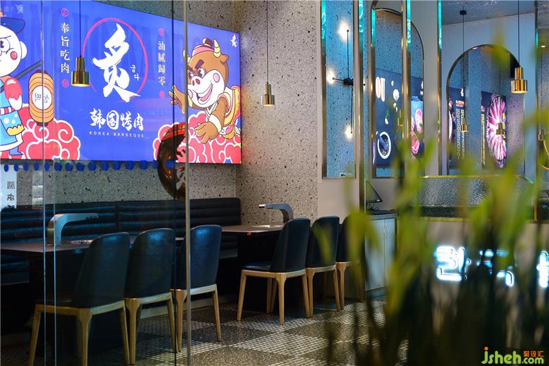進(jìn)入大廳左右兩側(cè)的卡座區(qū),環(huán)繞著醉人的燈光,柔軟的淡藍(lán)色,加之一抹興奮的橘黃,以及波光粼粼的天花,給人一種海洋中的感覺(jué),而在這時(shí),桌面上滋滋作響的烤肉,以及香味又把人們拉回到現(xiàn)實(shí)當(dāng)中,開始這趟美食之旅。