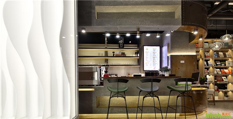主要材料:水磨石、鐵皮做舊、實木書架、水泥肌理漆、白沙粒、亞克力材料、消防管道、深灰色涂料