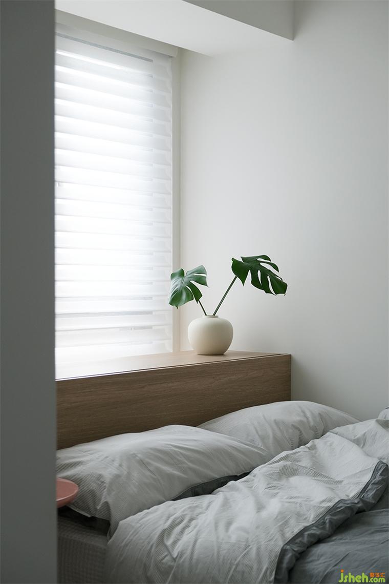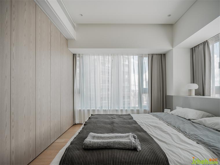 主臥延續(xù)奶茶色基調(diào),兩面臨窗,暖陽灑入,我們以同樣高度的淺灰色飾面,裝修設(shè)計整合東面臨窗區(qū)域為床頭區(qū),并安排儲物柜體,對面墻體則設(shè)置整面衣柜,高度統(tǒng)合的空間簡約而潔凈。