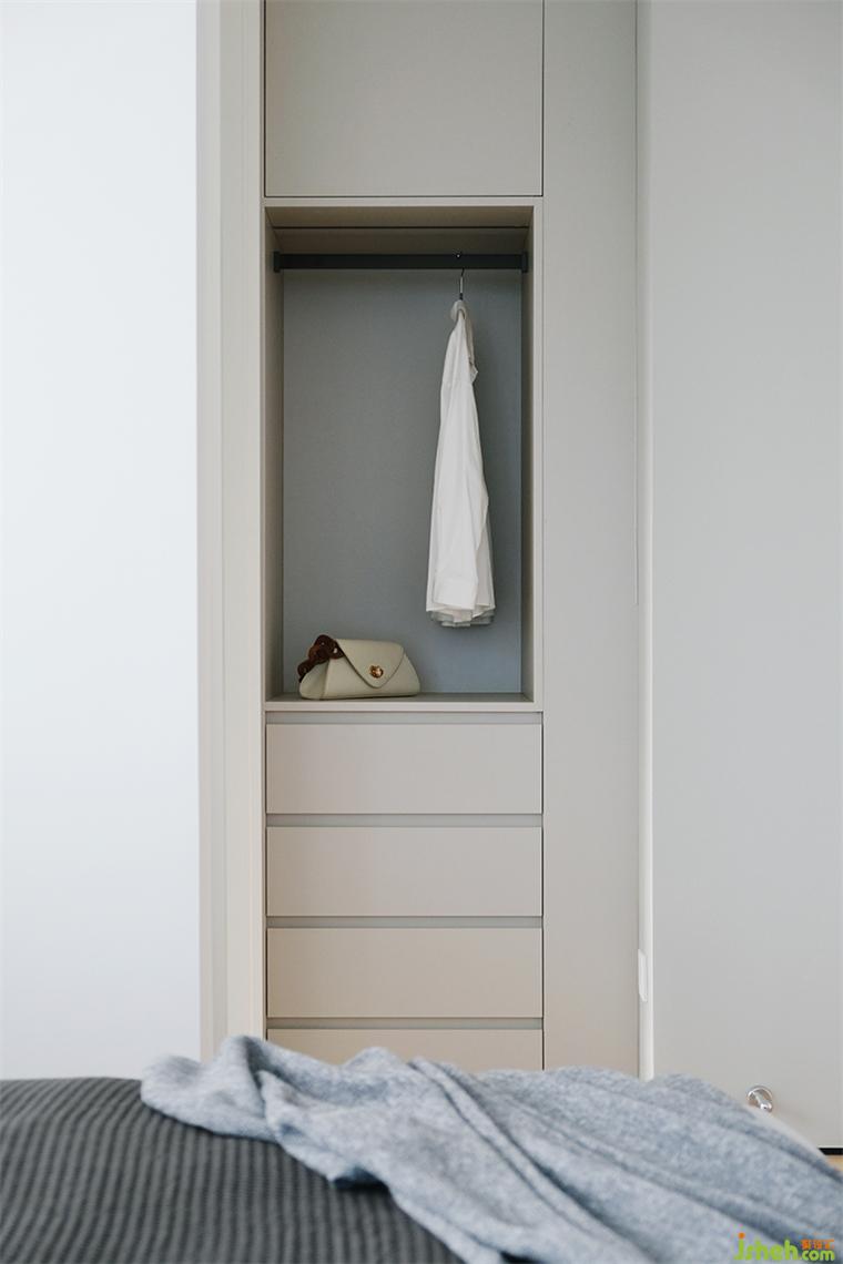 主衛(wèi)向內(nèi)縮進(jìn)后,在進(jìn)門處空出一個小小角落,設(shè)置成開放凈衣區(qū),待洗衣物便有了歸屬。