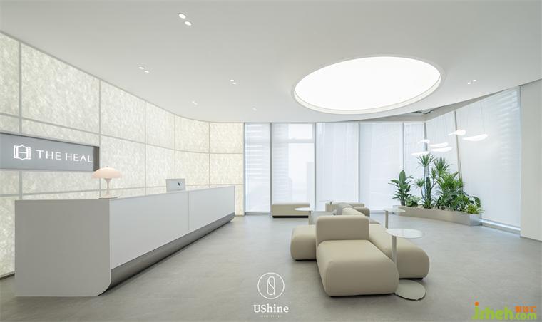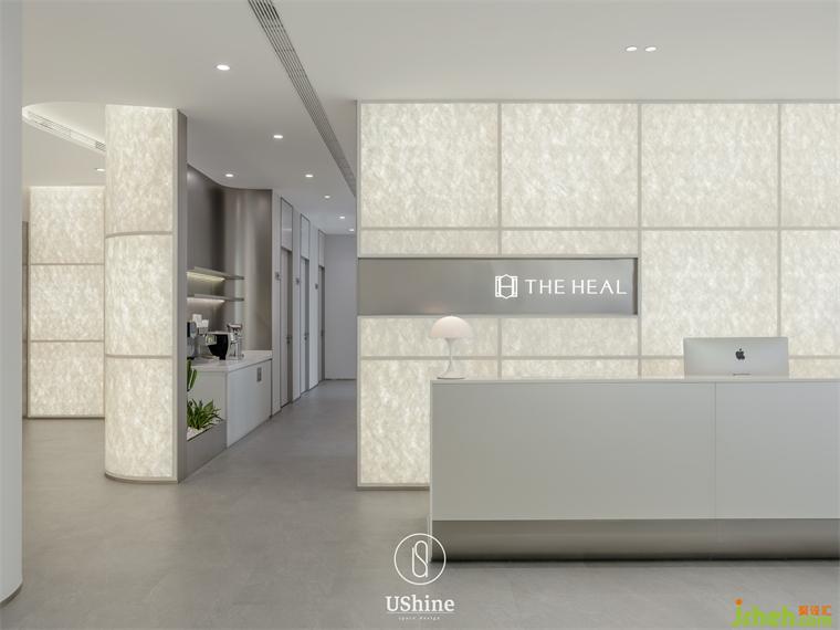形象墻墻面選用杜邦紙,墻體內(nèi)藏?zé)艄?,形成柔和?xì)膩的光效。杜邦紙?jiān)跓艄獾挠骋r下,凸顯出柔紗材質(zhì)的肌理感,彌漫細(xì)致柔和的氣質(zhì)氛圍。這一墻面的創(chuàng)新設(shè)計(jì),運(yùn)用在多個(gè)功能空間,深圳赫爾醫(yī)療美容診所裝修設(shè)計(jì)成為空間最重要的皮膚,詮釋溫和、細(xì)膩而朦朧的空間情緒。