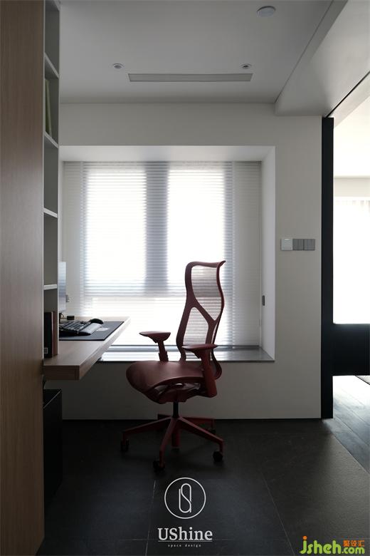 男主人希望有一個開放式的工作室,并能在需要時閉合。深圳海納公館家裝設計我們打掉最小臥室的非承重墻部分,將光線引入玄關,利用承重墻體做自然分隔,沿另一面墻依次設置封閉柜體、開放書架和書桌,延伸至飄窗,舒適而明亮。