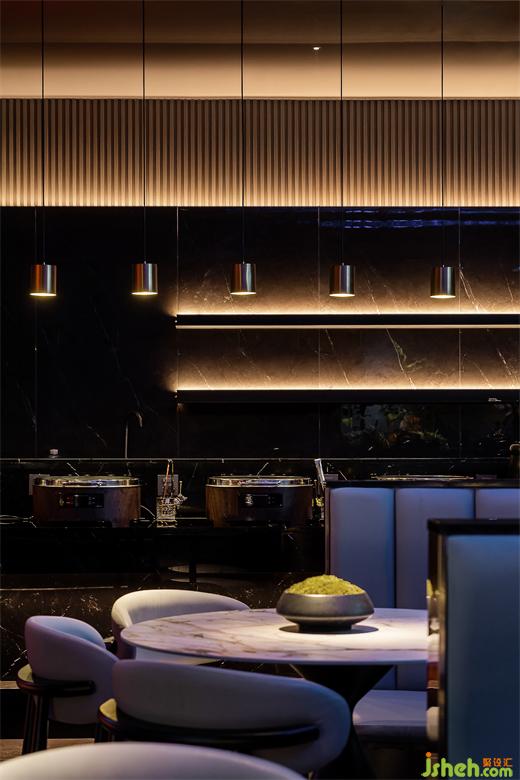 在自助餐廳的設(shè)計(jì)中,通過(guò)音樂(lè)、美食和色系的搭配以此實(shí)現(xiàn)置身度假狀態(tài)般的放松與愉悅,湯泉足道設(shè)計(jì)師為了貼合空間多元化的設(shè)計(jì)核心,強(qiáng)調(diào)休閑愜意的屬性,在流通的布局空間中制造相互對(duì)話的可能,讓眾多設(shè)計(jì)元素交織重組,從而變換出驚喜的空間。