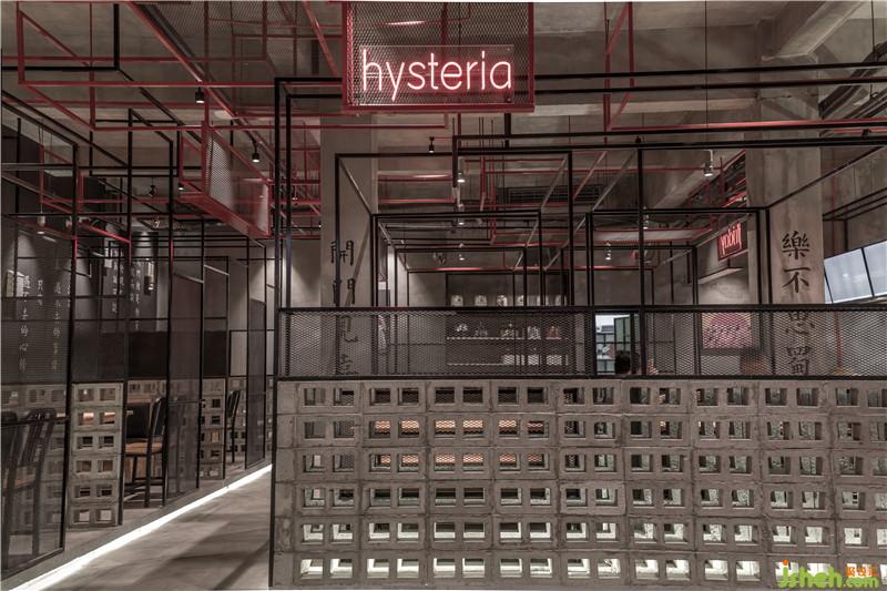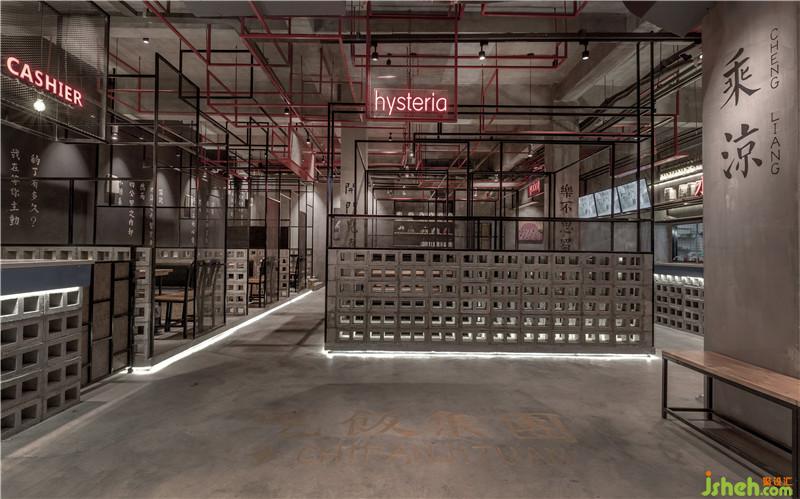 在設(shè)計(jì)過程中「工墨設(shè)計(jì)」團(tuán)隊(duì)也是本著「不堆砌」、「不浪費(fèi)」、「更多原創(chuàng)」的初心去營造這個(gè)餐廳。我們嘗試了一些原創(chuàng)設(shè)計(jì),與施工方一同研究并DIY了一些材料工藝,例如:為了制作符合現(xiàn)場(chǎng)尺寸的隔斷和吧臺(tái)材料,我們與施工方現(xiàn)場(chǎng)開模自制了一批特別尺寸和形狀的水泥空心磚;為了營造一種粗糙和精致共存的藝術(shù)裝置,我們與施工方一起研究鐵藝結(jié)構(gòu)和施工工藝,在兼顧設(shè)計(jì)美感和造價(jià)的條件下,制作出了天花和地面上紅黑對(duì)比分明,且時(shí)尚充滿視覺沖擊力的鐵藝和PVC管裝置,以及用20mm厚的特質(zhì)鐵藝方管制作而成的卡座及餐桌,等等?!感M吃飯集團(tuán)」的工程總預(yù)算控制也是設(shè)計(jì)中的亮點(diǎn),因?yàn)椴捎昧艘恍┝畠r(jià)和質(zhì)樸的材料工藝,最終總面積400㎡+的餐廳,硬裝和軟裝的總費(fèi)用控制在40萬左右,造價(jià)遠(yuǎn)低于同類型的餐飲空間。但材料的廉價(jià)并不意味著粗制濫造,恰恰相反,因?yàn)樵O(shè)計(jì)和造型的獨(dú)特性,使得空間最終呈現(xiàn)的效果獨(dú)具匠心。在設(shè)計(jì)中我們打破了圖案形狀作為導(dǎo)視和情緒傳遞的手法限制。在空間的墻面和立柱上,我們采用了例如:「乘涼」「樂不思蜀」「中國創(chuàng)造」「開門見喜」等宋體漢字。用當(dāng)代的設(shè)計(jì)語言,結(jié)合自然純樸的工藝手法。并融入中文漢字的形式加入趣味性的流行文化語言,粗中有細(xì)、即樸素又現(xiàn)代,在強(qiáng)烈的沖擊中,讓空間的氛圍變得特別。