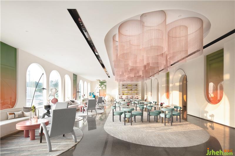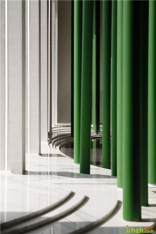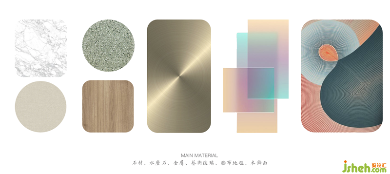 主要材質(zhì):多彩長虹玻璃、不銹鋼、爵士白大理石、漸變金屬鏈條裝置、水磨石