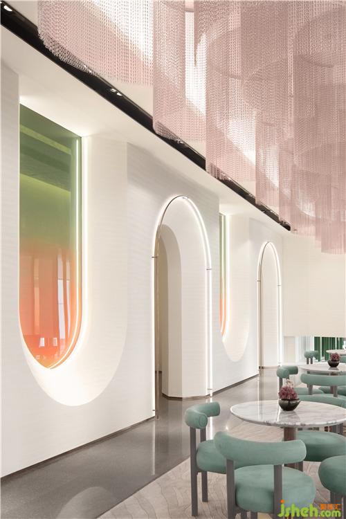 Explore the land mark with stone, hold the flow line through it, deduce the magic shape of guangxi landscape terrace, green metal bamboo forest set up next to the sand table, and stainless steel corrugated plate to stir the ripples in the lake, inadvertently lift the eye, you can see the ripples in the water, into the faintly colored lines, extending infinitely in the space.