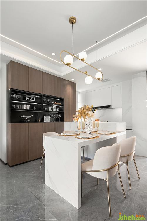 餐廳的設計以灰色調(diào)簡約的家具造型來突出,家具的線條也是簡約為主 ,燈具采用金屬材質(zhì)來體現(xiàn)出質(zhì)感,餐椅為小巧為主,使得空間更為空曠。