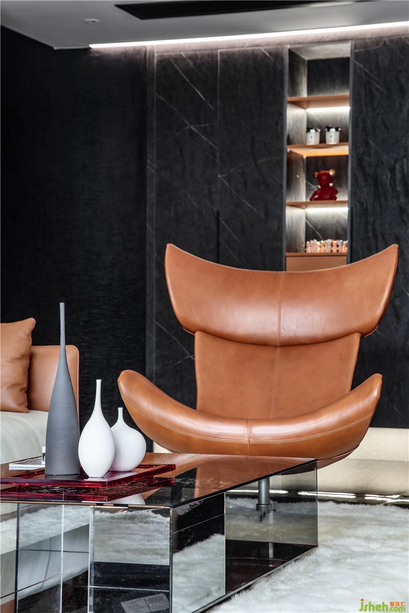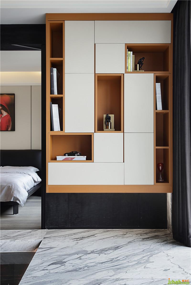 為了色調(diào)的空間平衡,我在Imola的對(duì)角位置設(shè)計(jì)了這組與沙發(fā)配色相近的裝飾書柜,細(xì)看的話會(huì)發(fā)現(xiàn)不少細(xì)節(jié),耐人尋味。通過旁邊敞開的隱形門隱約能見的是客房。
